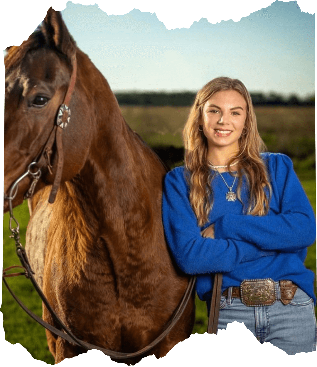 My name is Annsley Hurst, and two of the biggest parts of my life are kids and rodeo. I’ve been riding horses since I could walk. I especially love speed events. One of my favorite things is being able to help younger riders and share what I’ve learned along the way. Passing on knowledge and encouraging kids is something I truly care about. I’m currently a senior in high school and will be graduating not only with my diploma, but also with my associate degree in education. I plan to attend college to pursue a degree in nursing while also competing on my college’s rodeo team. Some of my rodeo accomplishments include being named 4-H State Champion – Stakes (2022), 4-H District All Around Yearling Halter Champion (2023) and 4-H District Champion – Barrel Racing (2025). I’ve also earned multiple pole bending titles, including 4-H Reserve State Champion – Pole Bending (2024 & 2025), STBRA Pole Bending Youth Champion (2024), STBRA Pole Bending Reserve Open Champion (2024), Smokin Guns Reserve Pole Bending Open Champion (2025), and Smokin Guns Reserve Pole Bending Youth Champion (2025).